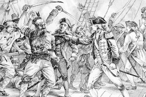 An artist's rendering of the battle between Blackbeard's crew and British naval forces on Ocracoke. Image courtesy of the Outer Banks History Center.
