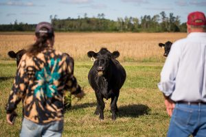 Davis and Cartwright approach one of several cows grazing in a field at the family farm.