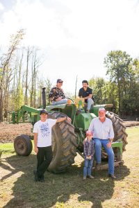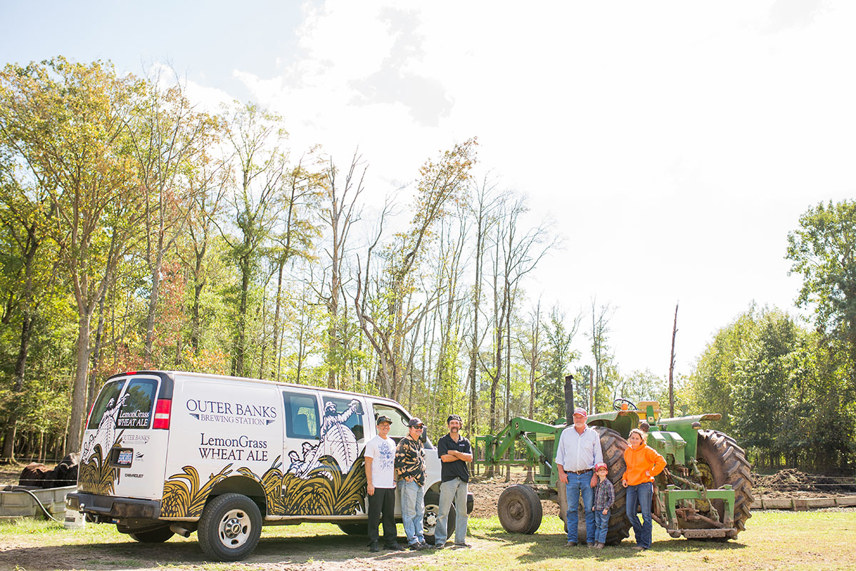 From left to right: Outer Banks Brewing Station's head chef, Tony Duman, and co-owners Aubrey Davis and Eric Reece with Hertford farmer Russell Cartwright, Cartwright's five-year-old grandson, Carter, and his teenage daughter, Sarah, at the Cartwright family farm. All photos by Ryan Moser.