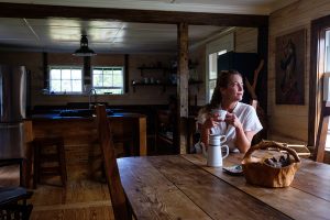 Author Kelley Shinn sits at her kitchen table. Old wood found during the renovations was used to craft the kitchen island just behind her.