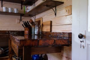 The kitchen counters were made with wood from an outdoor fishing table and old electric company cable ties.